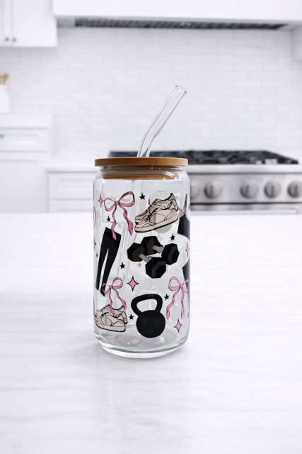 Meet your everyday motivation in a cup. Our 16oz Hydrababe Glass Can is designed for the girl who lifts heavy, drinks her water, and looks cute doing it. Featuring our signature feminine fitness aestethetic, this glass can is perfect for iced coffee, protein shakes, matcha, or daily hydration.